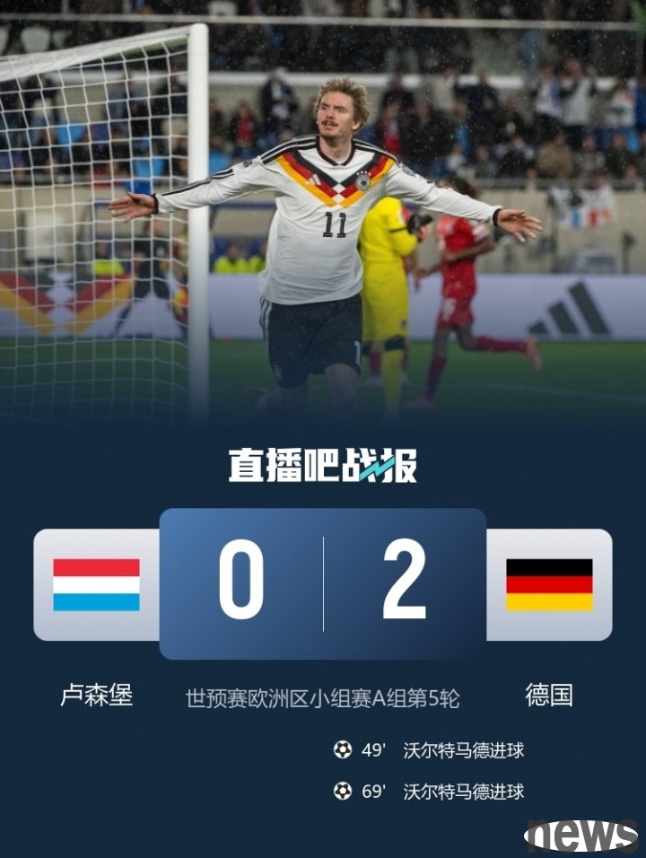 In the 5th round of the European group stage of the World Cup preliminaries, Germany defeated Luxembourg 2-0 in an away game, with Walter Mader outflanking and scoring twice. Germany can advance to first place if it draws with Slovakia in the final round.