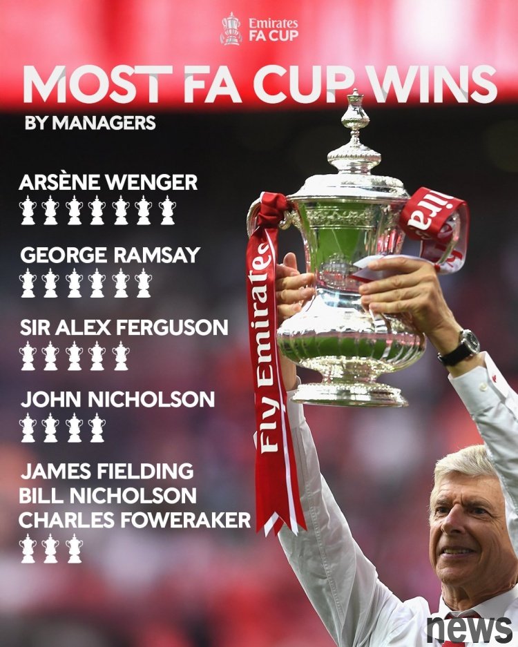 The FA Cup officially counted the number of times the coach led the team to win the championship and listed it on the list. Wenger won the FA Cup 7 times.
