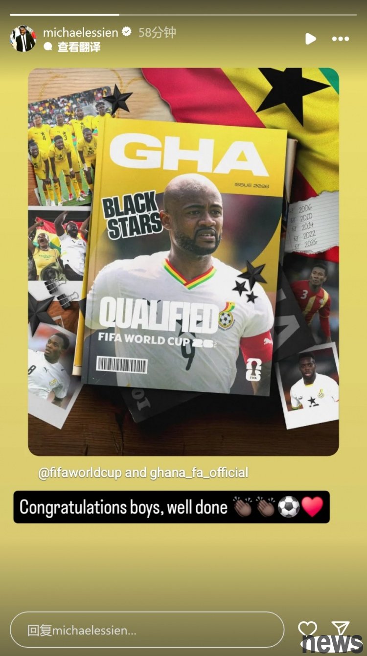 Ghanaian football legend Michael Essien retweeted a poster on social media to congratulate Ghana on entering the World Cup, with the text: "Congratulations boys, well done!"