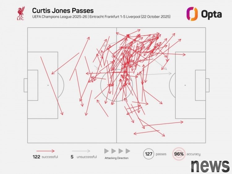 In this campaign, Curtis Jones played the entire game for Liverpool and successfully passed the ball 122 times. This is the record for successful passes by a Liverpool player in a single game in the Champions League since the Opta statistics of the 2003-2004 season.
