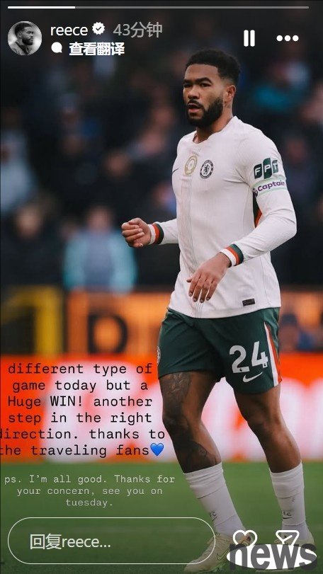 In Chelsea's 2-0 Premier League match against Burnley, Reece James was replaced at halftime. He updated social media after the game to report that he was safe.