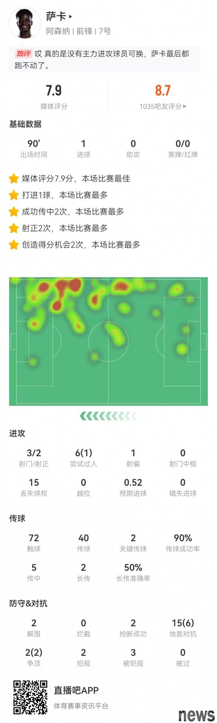 Arsenal drew 2-2 with Sunderland in this round of the Premier League. Saka's statistics for this game are as follows:
