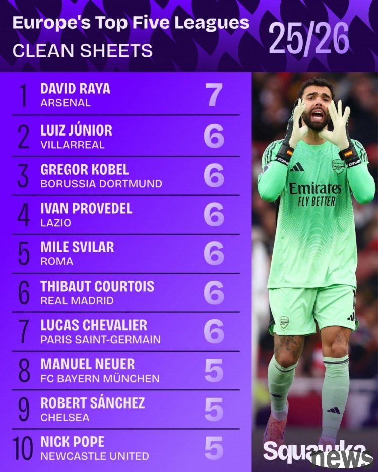 The war in the five major leagues is about to resume. The data agency squakwa also compiled the list of clean sheets among goalkeepers in the five major leagues this season, with Gunners goalkeeper Raya ranking first.