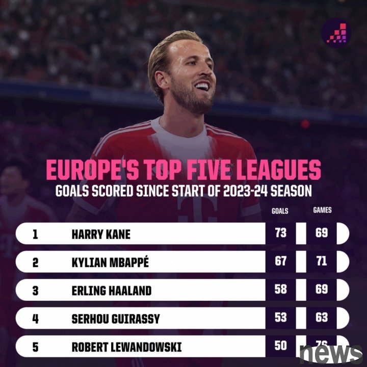 According to OPTA statistics, since the 2023-24 season, Kane is the player with the most goals in the five major leagues. He has scored 73 goals in 69 league games.